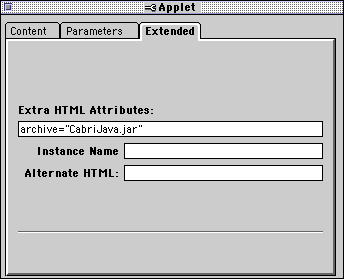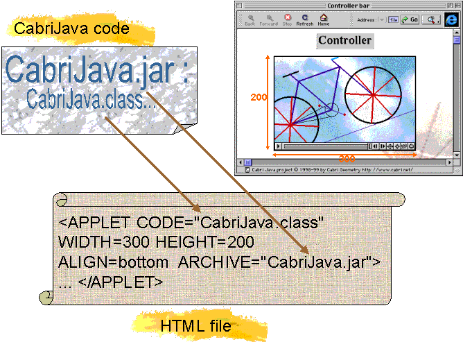 - ARCHIVE: indicate that the code is compressed in a file (format zip called in Java jar, as java archive). It is the case of CabriJava: only one CabriJava.jar file contains all that is necessary.